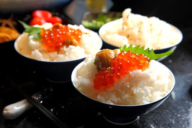 附餐除了台梗九號香米飯及烏龍麵兩種選擇外,也可以加價250元升級海膽飯,口感溫潤鮮味濃郁的海膽加上海潮風味滿點的鮭魚卵,光這碗飯就值回票價惹!