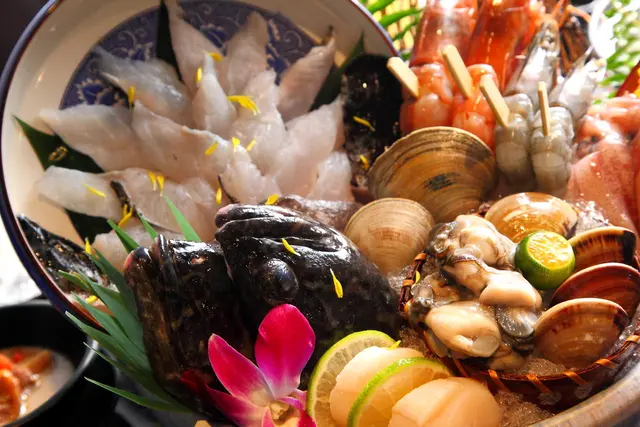 根本就是一艘大豐收的漁船嘛!有超大的牛奶貝、貼心去殼的天使紅蝦、大草蝦、生食級大干貝、新鮮透抽等
