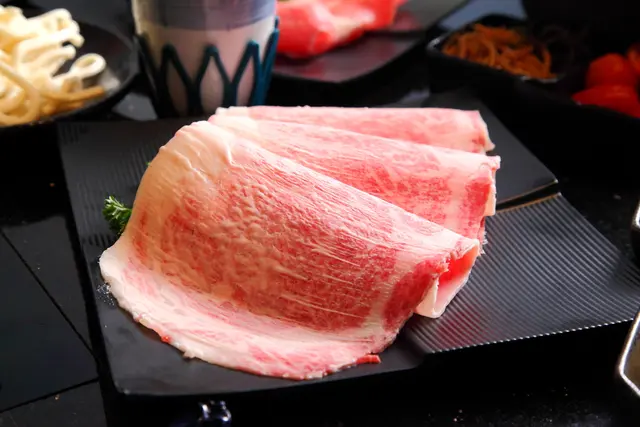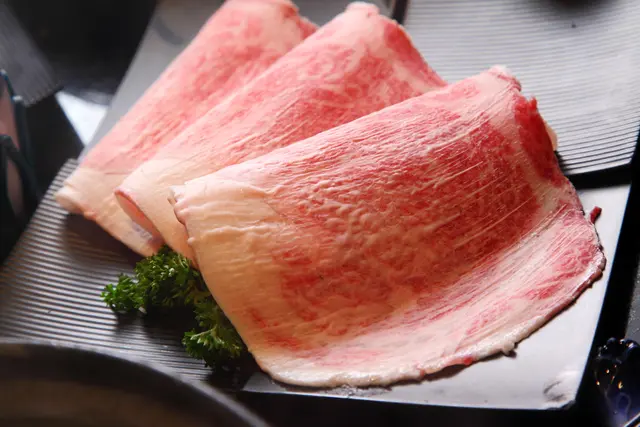 肉質呈現完美粉嫩的桃紅色澤,脂肪油花則為雪白色,油花分布均勻,霜降?不!這油花應該用北海道大風雪級來形容,美炸了!聽說在室溫底下油脂就會融化呢