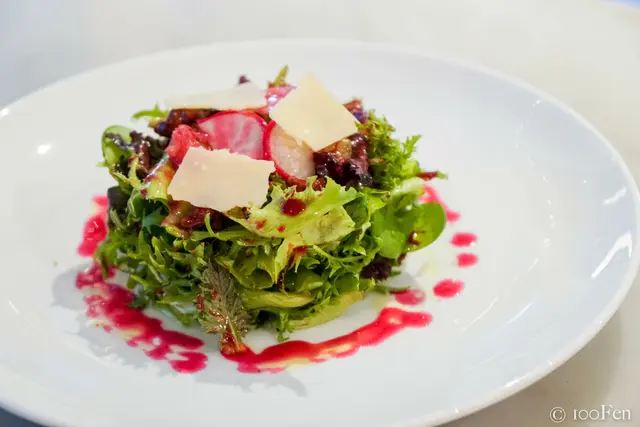 附餐的沙拉以新鮮生菜搭配甜菜根及油醋,