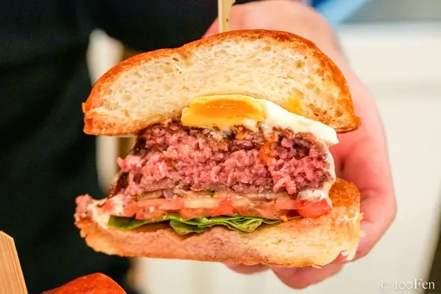 中間粉嫩半熟的漢堡排多汁誘人,