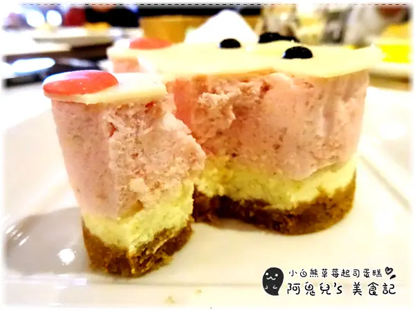草莓慕斯和起司蛋糕搭配起來滿好吃的喔!下層的起司蛋糕偏重乳酪