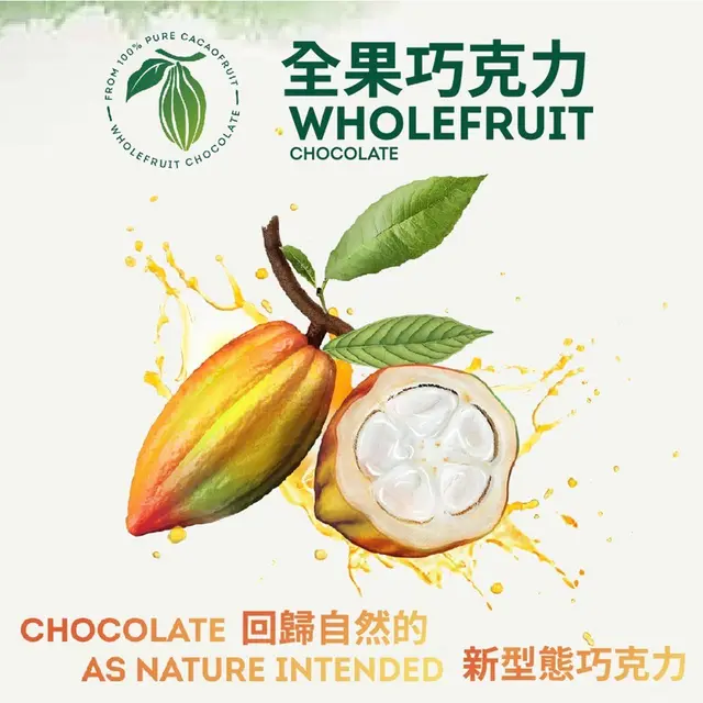 所謂的全果巧克力,是將原本會在製造過程中,被丟棄的可可果肉,透過獨家技術重製成糖,再加回到巧克力製程當中,100%發揮可可豆的潛能,是回歸自然的新型態巧克力,是環保永續的概念,讓我們一起對地球更好。