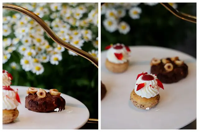 這三層塔中包含五款甜點、三款鹹點,建議先從鹹食開始食用。三款鹹點也分別融入頂級巧克力元素。