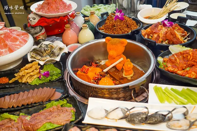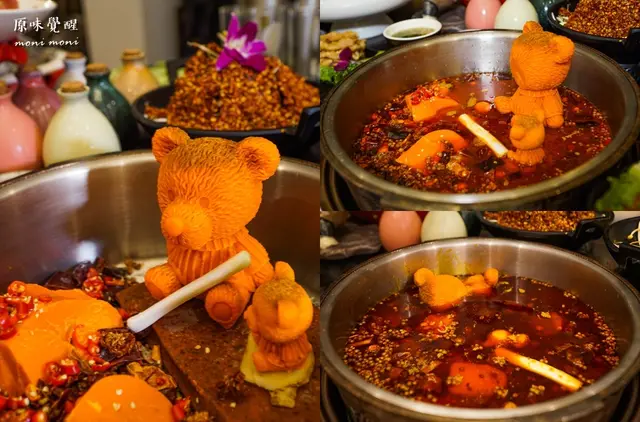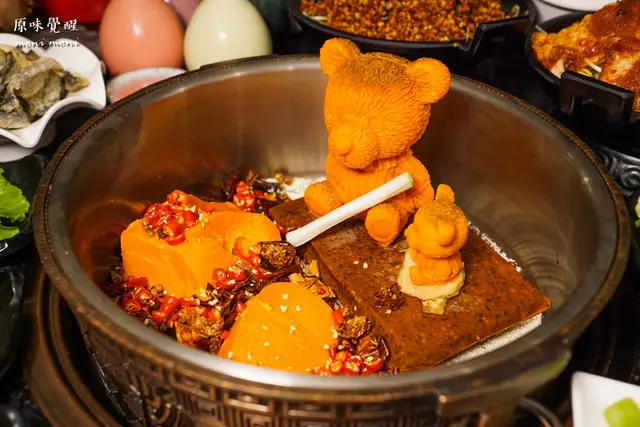 麻辣鍋中紅通通的岩漿,伴隨著溫和的中藥香,中間還有討喜可愛的小熊,