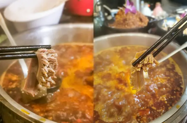 紅油炒料完全以牛油炒製,倒入蔬菜和雞骨、豬骨熬製的高湯,