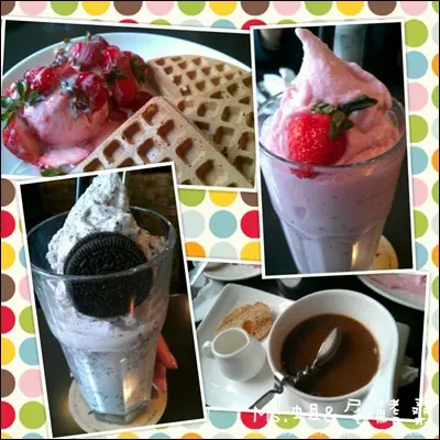 因為肚子還飽飽的,所以我們簡單點了份草莓冰淇淋鬆餅(170元)三個人分著吃,剛出爐燒燙燙的鬆餅搭配草莓冰淇淋或卡士達醬都很好吃,而看起來顆顆鮮甜飽滿的草莓居然都是切半的,讓人有點失望,但草莓的鮮甜足以彌補這項缺點。