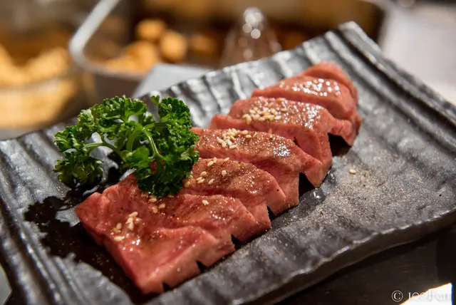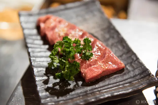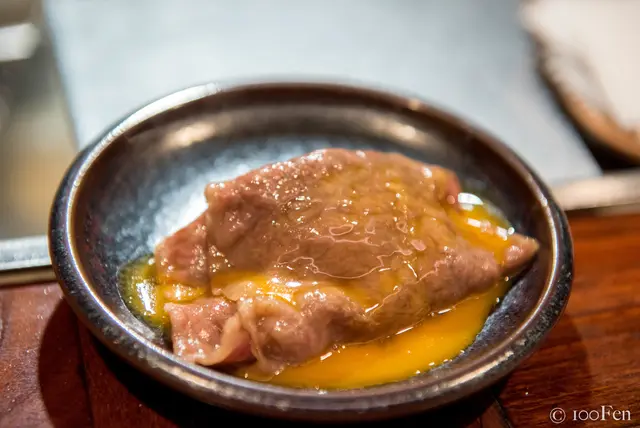 烤好的牛舌中心仍保持粉嫩,而表皮帶有微微的脆。咬下去雖說是較有彈性的口感,但因為和牛肉質細緻,吃起來仍然是非常柔嫩的;適量的沾上檸檬後,清新的酸氣更襯托了燒烤過後的肉香,好吃。這道是朋友本次的最愛,不過價格也是非常驚人...