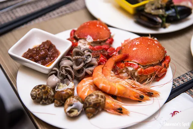 我喜歡吃蟹卻沒有研究在什麼季節吃什麼蟹最好,不過就姑且當作旭蟹是當季的螃蟹吧!我隨意地打開品嚐蠻多肉且重點是有鮮甜耶!冰鎮鮮蝦新鮮且很好剝殼,小章魚Q彈口感搭配醬料蠻香的說!