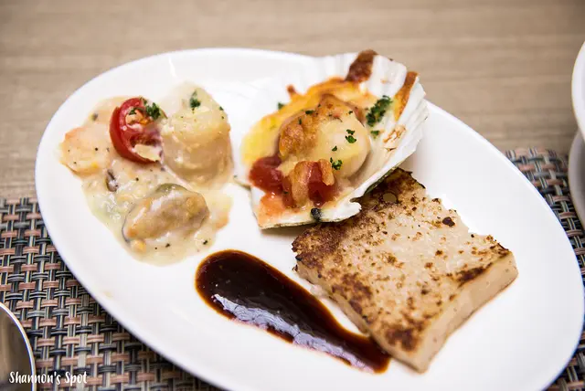 把焗烤奶油海鮮搭配上大蒜汁魚捲很好吃耶,奶香又結合了些大蒜香,一直重複說海鮮新鮮所以就試好吃(因為師傅料理出來的也適中),最後跳一下中式的蘿蔔糕外皮微酥口,我本身就很愛蘿蔔糕這道料理所以漿味只要不要蓋過白蘿蔔香氣基本上我都能接受,這個是品嚐得到些許蘿蔔本身的香氣!