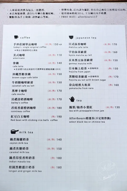 Afterhours Cafe飲料菜單:手沖、咖啡、奶茶、抹茶、焙茶、玄米。