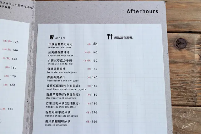 坐到座位上後,Afterhours Cafe店家會提供兩本飲料菜單,有咖啡、茶、果汁、巧克力、奶昔、冰沙,餐點的菜單則在櫃台後方的黑板上,有輕食類早午餐也有蛋糕類。
