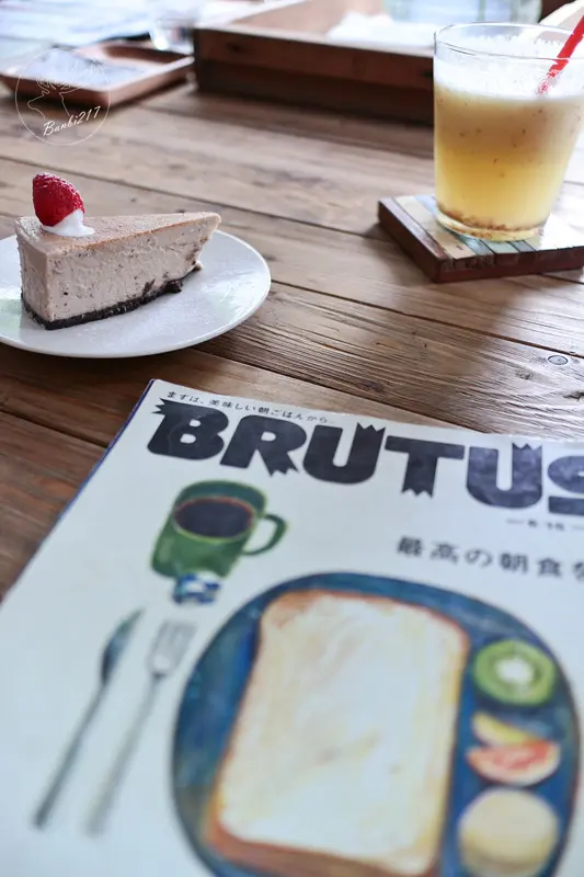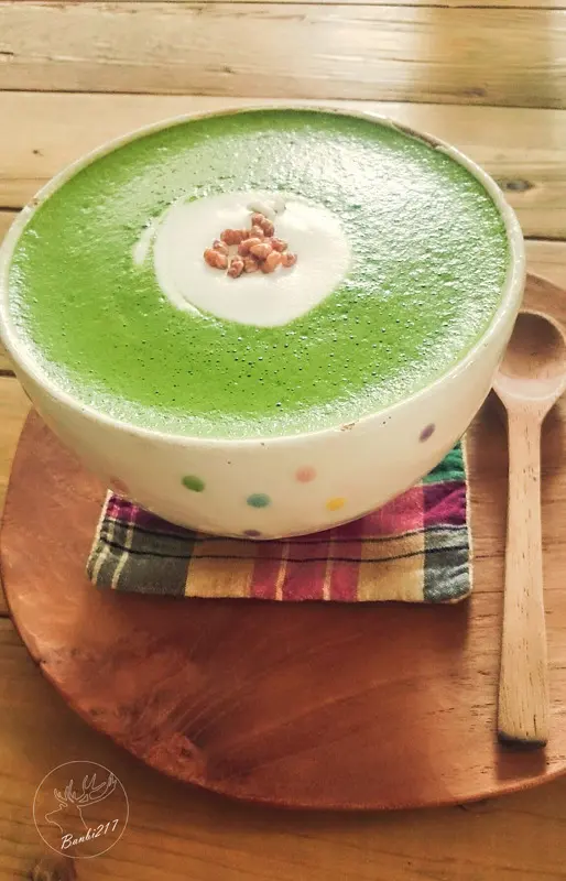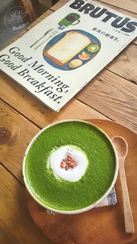 因為蕾蕾和我都是抹茶控便點了宇治抹茶歐蕾給蕾蕾喝,宇治抹茶歐蕾就是所謂的抹茶拿鐵,盛裝抹茶歐蕾的彩色點點小碗搭配格紋布、木湯匙、原木盤的造型很討喜可愛。雖有牛奶,但抹茶濃郁的味道沒有被覆蓋掉,喝的到抹茶自然的茶苦回甘味,上方多了烤玄米更能增加味道層次。