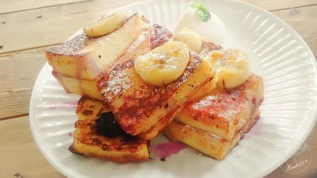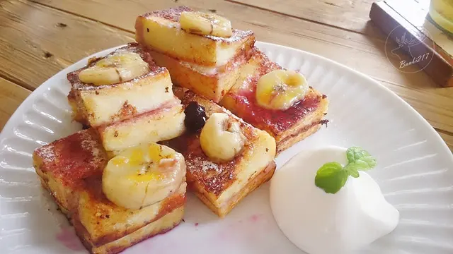 基於對香蕉的愛慕程度,見到名稱有香蕉便二話不說和老闆招喚了它。柔軟的奶油煎法式吐司透著起司的鹹香味,另外多了香蕉、藍莓還有柔順的鮮奶油作伴,是個簡單卻不錯的法式吐司。