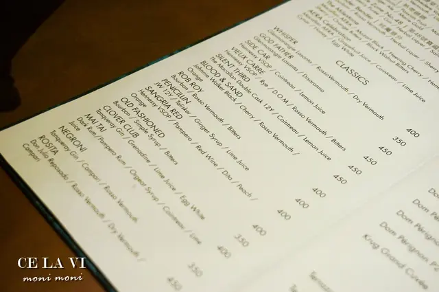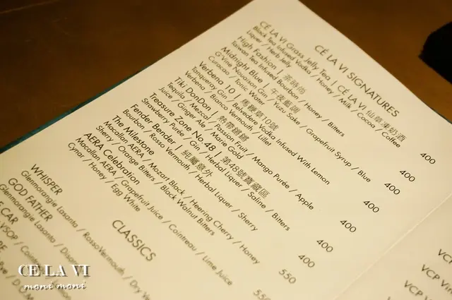 調酒種類主要有CÉ LA VI 特調、Classics 經典調酒兩系列,我們這次各點了四杯來,價位$350~550之間。