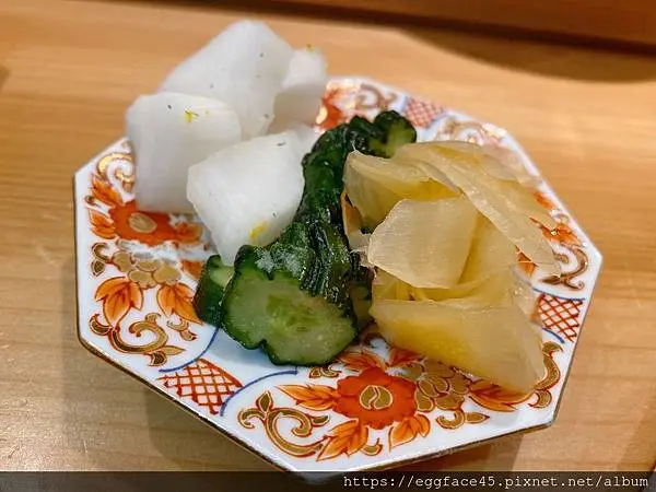 ▼壽司小菜:醃蘿蔔、黃瓜、薑片