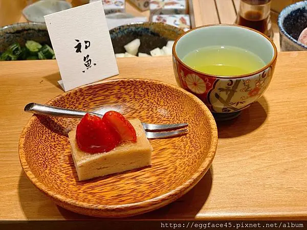這是今日的甜點,草莓輕乳酪吃起來微酸甜又清爽,搭配熱熱的綠茶剛剛好!