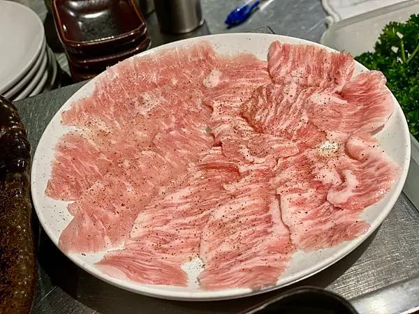 ▼切好的厚牛舌,可先吃原味或沾檸檬汁,