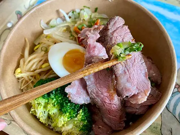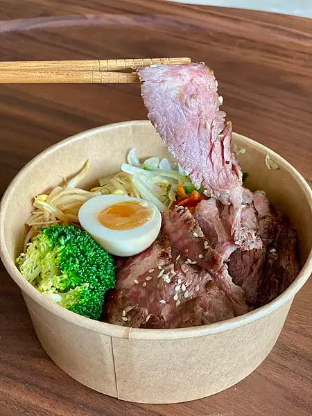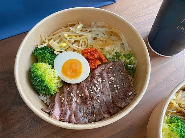 舒肥無骨牛小排、青花菜、涼拌豆芽菜、辣蘿蔔干、洋蔥絲、