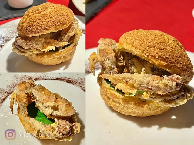 誰說泡芙一定要是甜的,超有創意的蟹肉泡芙,一次一整顆大口塞入口中,一大口咬下超多層次,還會噴出鮮奶蔬菜泥,鮮甜的醬汁更能引出蟹肉的鮮甜~