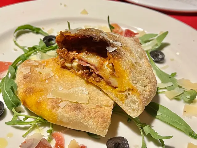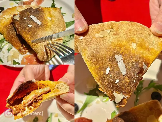 披薩的起源地拿坡里,18世紀開始有這種餃子外型的披薩,台灣比較少吃得到這樣的披薩,裏頭包了滿滿的肉餡及起司,一口咬下香氣十足,吃起來頗有層次感!