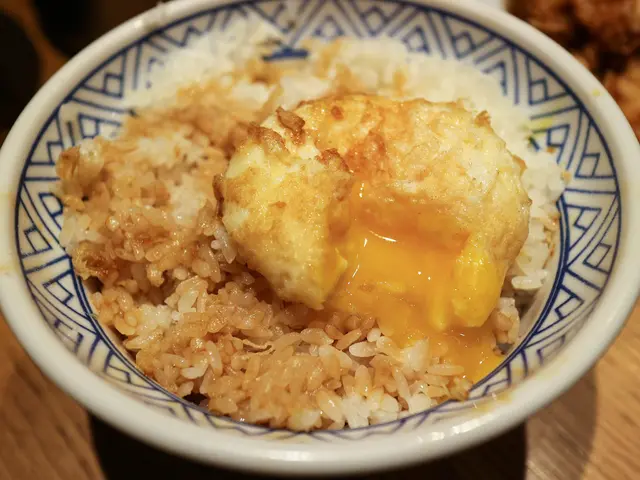 可以先吃原味淋醬汁的飯再來將蛋搓破拌一拌一起吃