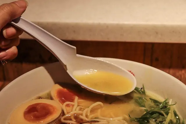 雞白湯:湯頭油脂不算多,滑順鮮甜,溫潤而融洽,充滿著雞鮮味。麵屋一燈湯頭最令我受不了的大概就是那股太強烈的動物氣味,第一口是濃郁味美但實在很不耐喝,膩感在沒喝幾口後就馬上竄起。