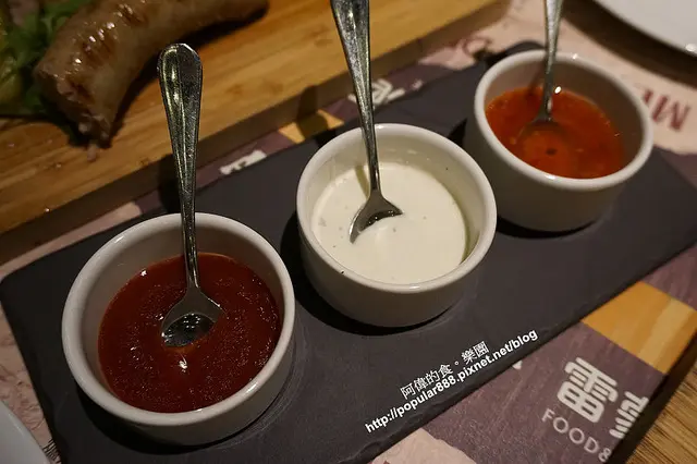 三種沾醬:左起是番茄醬、優格醬、泰式酸辣醬