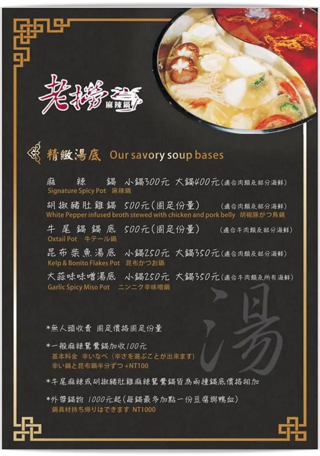 店內除了招牌麻辣鍋,還有胡椒豬肚雞鍋/牛尾鍋鍋底/昆布柴魚湯底/大蒜味味噌湯底,