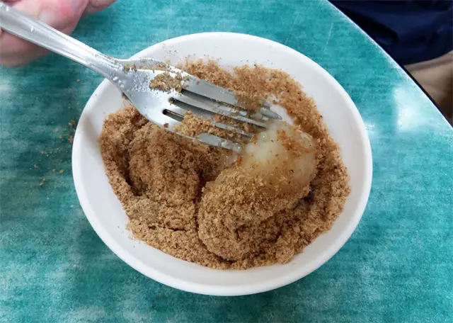 燒麻糬熱呼呼、軟嫩嫩的香Q口感搭配花生粉好香甜。一份2顆,40元。