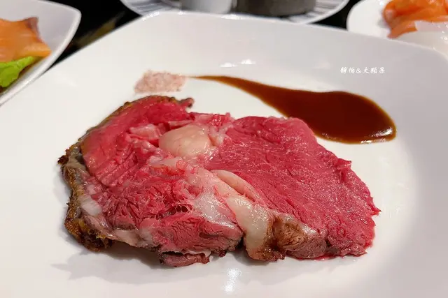 熟食區更厲害的就是這個爐烤肋眼牛排了,一大片的爐烤肋眼在牛排餐廳不便宜啊,在這裡想吃幾片就吃幾片,看起來很紅很生但不見血,也格外嫩口,我們家孩子跟我說好好吃,吃了兩片