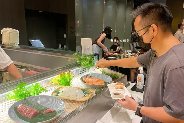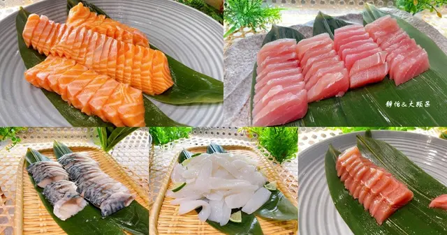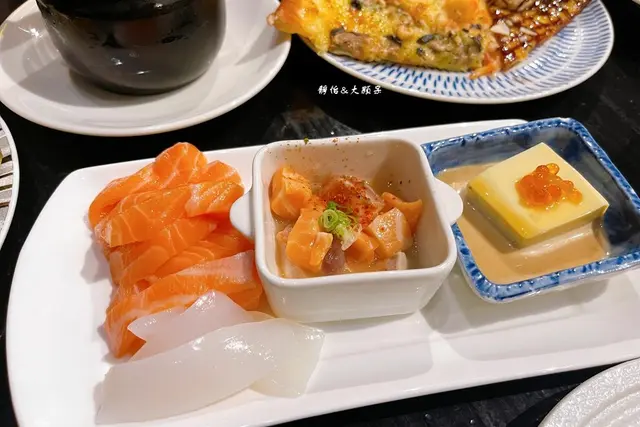 除了每日嚴選現撈漁獲的新鮮現切生魚片外,還有師傅現場握製的炙燒握壽司、手卷及日式涼拌小菜等,看看那生魚片真是太誘人了,我們最愛的鮭魚油花也都好美,握壽司還有干貝喔