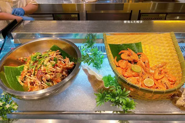 除了各式新鮮生菜沙拉外,還有精彩涼拌菜像是泰式涼拌蟹、五味小章魚海瓜子、淡菜、辣味牛肉沙拉及蝦子等