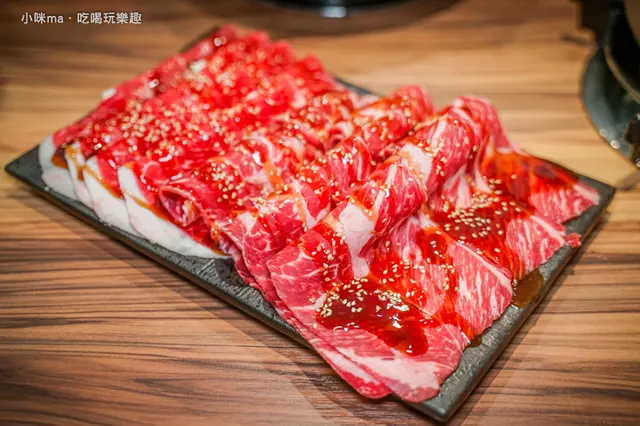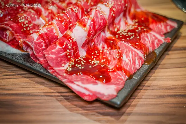 極品美國PRIME霜降牛油花分布均勻,肉質帶有些微咬勁,襯著烤肉醬的鹹香更對味