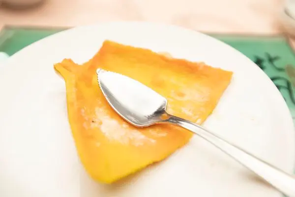 有點微鹹甜的滋味,但木瓜並不是主要甜味來源,而是上頭的美乃滋,