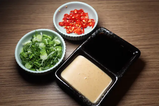分別為胡椒粉、柚子胡椒、香油 、店家特調的胡麻醬(以胡麻醬為基底加入了客家桔醬),日式醋醬油