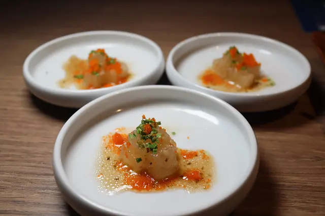 前菜:輕發酵一夜醬菜海鮮湯凍(搭配上蝦卵/蝦夷蔥末)