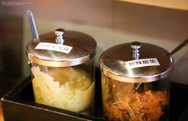 座位區上還有另外放置生大蒜與炒辣酸菜提供給用餐的客人調味