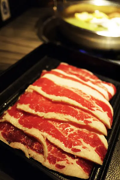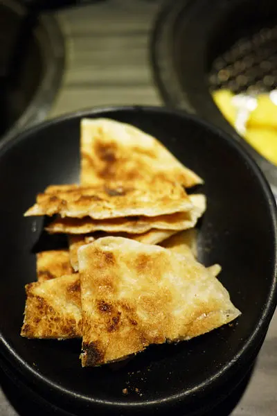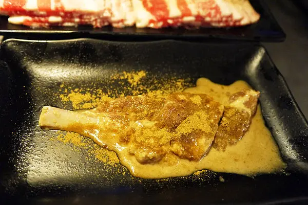 第一輪點的肉類很快上桌,右邊是骰子牛肉質超嫩第一口就愛上它,左邊的是印地安雞腿肉,己經有醃漬調味過了,這道有辣,不過味道調得很棒,我很喜歡。