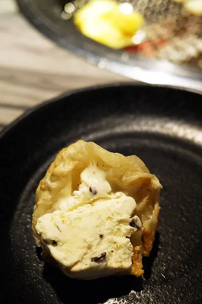 烤好呈球狀的麻糬包著冰淇淋,熱熱的吃下去,有冰火五重天的感覺,第一次吃到特殊的吃法。