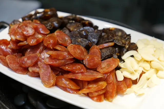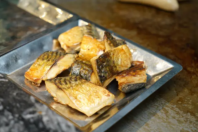 鐵板上煎著米腸、牛肉香腸、還有日本一夜干鯖魚