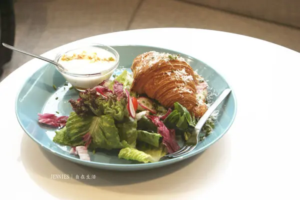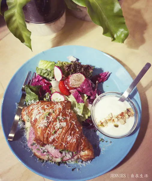 義大利帕芙隆乳酪火腿可頌通過三個人一致好評,NT360元,優格與沙拉還有一份可頌的悠閒。可頌裡面夾起司及沙拉還有火腿乳酪,當天吃的時候有驚喜,第一次吃到那麼好吃的可頌麵包及餡料,捨不得自己獨吞,分享就是最好的味道!