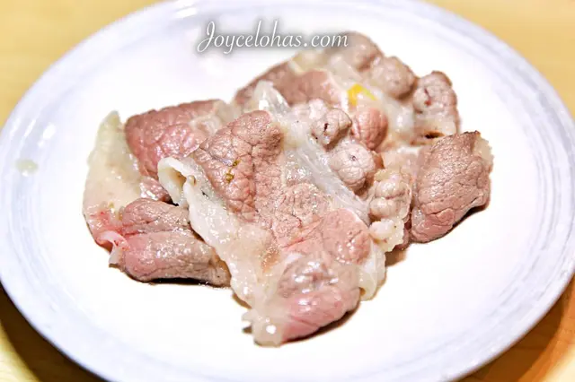 ▼脂肪紋路分布很均勻的牛五花,店家特別厚切約有0.3公分厚度,吃起來油肉相間的柔軟口感更明顯。