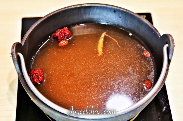 桂圓、當歸、黃耆,蔘鬚、紅棗等八種中藥再加上密制藥膳熬煮的湯頭,喝起來是多種不同藥材的甜滋味,滋補養身又清新順喉。