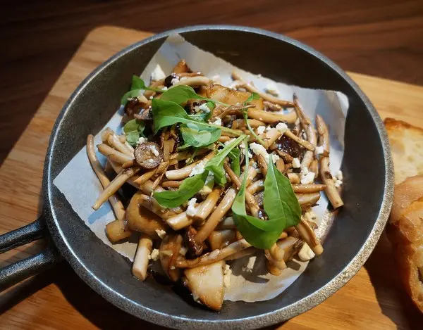 先將柳松菇烤過後,再與杏鮑菇熱炒,鹹香夠味,上面鋪著費達起司更濃郁與滑順,