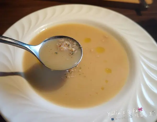 當天提供馬鈴薯濃湯,完全使用馬鈴薯與蔬果熬成的湯頭,在淋上初榨橄欖油,
