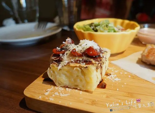 使用通心粉下去焗烤,上面淋上油醋 起司絲 與烘烤番茄,通心粉經過烤後變得更有嚼勁有口感,