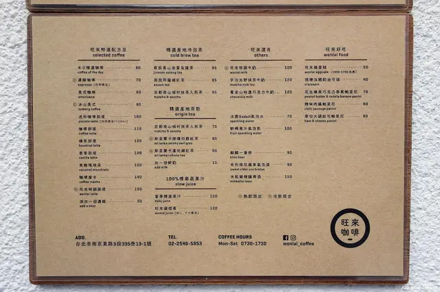 向來對於這種別有情調的街邊小店特別感興趣,便一直把旺來咖啡放在口袋名單裡,休假日找個機會來瞧瞧,話說某回看到永春站的Stone Espressobar在專頁上介紹這間店,才知道原來旺來是民生社區哈古小館老闆新開的店,採用的咖啡豆則是由Stone Espressobar提供,既然兩家都是自己喜歡的店,也沒有不來的道理。