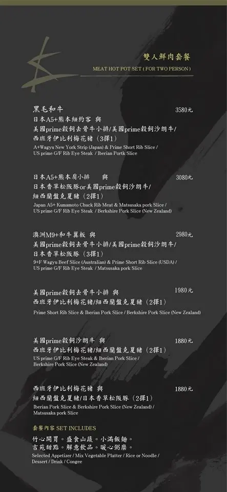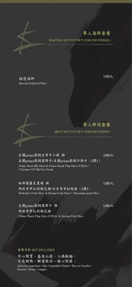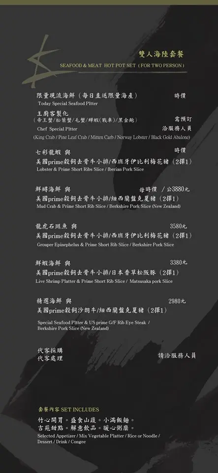主要提供單人及雙人套餐,另有其他單點的海鮮、肉品、蔬菜及酒類等,詳細菜單請見店家粉專