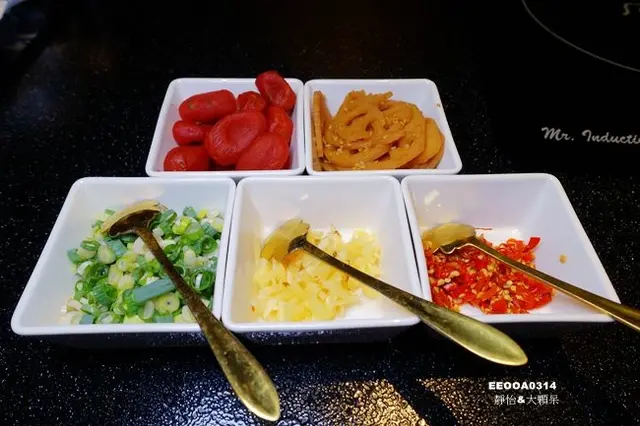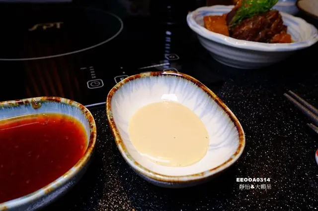 點好餐後服務人員即送上醬料及開胃小菜,火鍋沾醬有柑橘醬油及胡麻醬,可以依照個人喜好加入蔥花、大蒜及辣椒,柑橘醬油裡面有加蘿蔔泥,清爽日式風格適合搭配海鮮,胡麻醬則適合沾肉片,不過新鮮的食材吃原味是最棒的了,我們很少沾醬..
